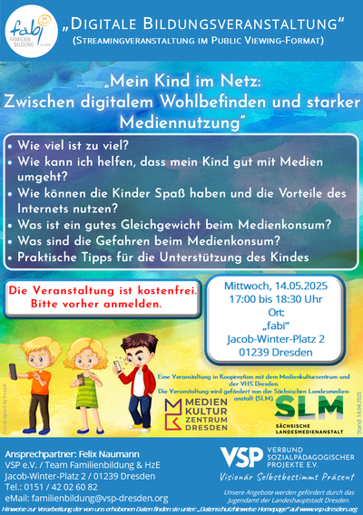 Mitte Mai boten wir euch die dritte Onlinbildungsveranstaltung zum Thema "Mein Kind im Netz: Zwischen digitalem Wohlbefinden und starker Mediennutzung" an.