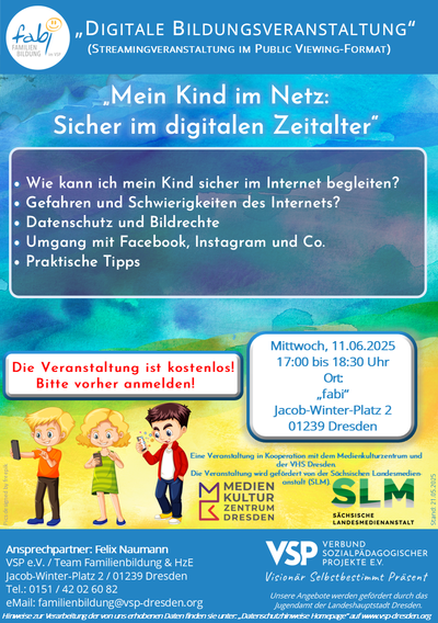 Mitte Juni habe wir euch gerne zur vierten kostenlosen Onlinbildungsveranstaltung zum Thema "Mein Kind im Netz: Sicher im digitalen Zeitalter" eingeladen.