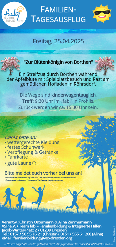Ende April waren wir mit euch wandern. Beim Familientagesausflug habe wir mit euch die "Blütenkönigin von Borthen" besucht und mit euch gemeinsam einen Streifzug durch Borthen unternommen.