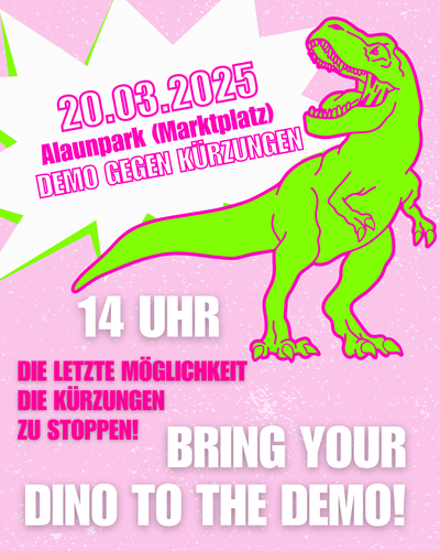 Mit dem Slogan "Bring your Dino to the Demo!" haben wir zur Demonstrationsteilnahme gegen die geplanten Haushaltskürzungen der Stadt Dresden aufgerufen und haben mit euch im Rahmen des Familientreffs aktiv daran teilgenommen.