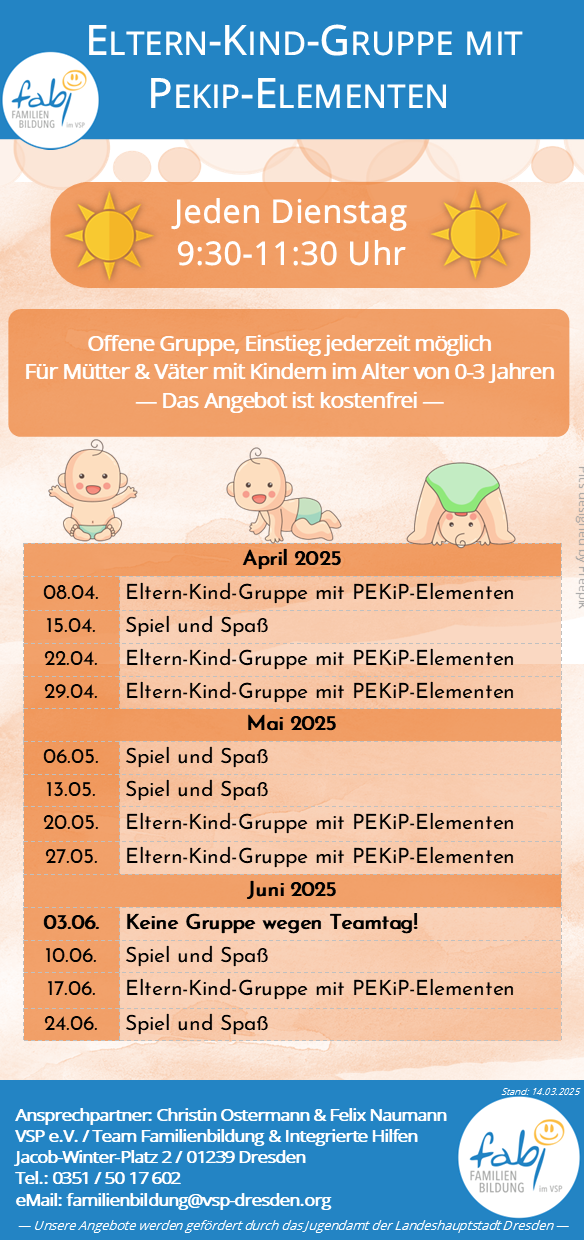 Seit dem 08. April findet an unserem Standort jeden Dienstag von 9:30 bis 11:30 Uhr wieder die Eltern-Kind-Gruppe statt. Als besonderes Angebot sollen dann in dieser Gruppe regelmäßig Termine mit PEKiP-Elementen stattfinden.