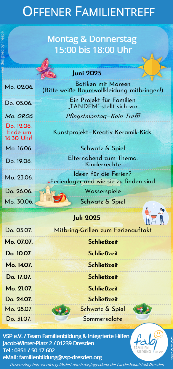 Wie gehabt trefft ihr uns zu unserem regulären Familientreffangebot sowie während der Eltern-Kind-Gruppe vor Ort an.