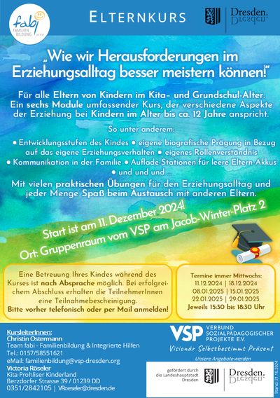 Gegen Ende des Jahres startet im Dezember ein Elternkurs statt. Dieser wird dann gemeinsam mit der Kita Prohliser Kinderland stattfinden.