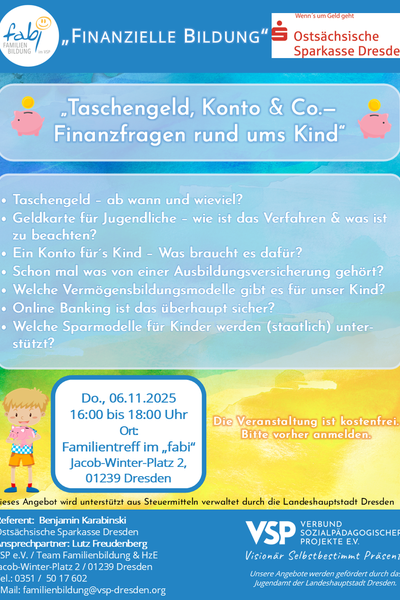 Im November möchten wir euch herzlich zu unserer ersten finanziellen Bildungsveranstaltung zum Thema "Taschengeld, Konto & Co - Finanzfragen rund ums Kind" begrüßen, die wir zusammen mit der Ostsächsische Sparkasse im Rahmen unseren Familientreffs durchführen.