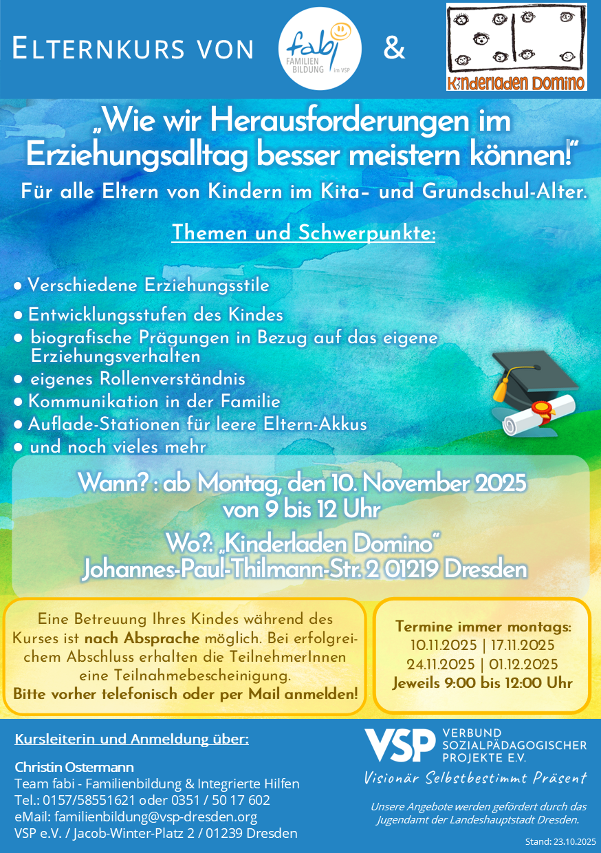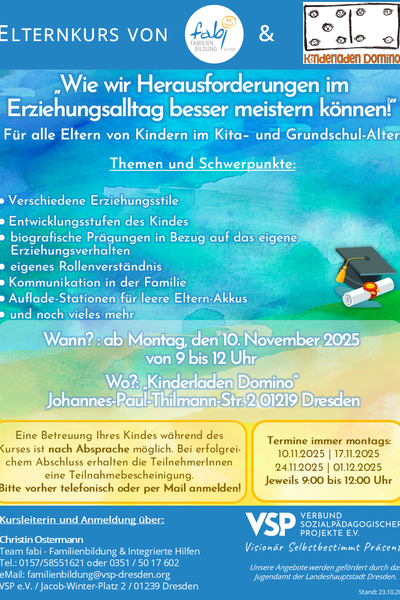 Ebenfalls im November startet ein Elternkurs, den wir gemeinsam mit dem Kinderladen Domino umsetzen.
