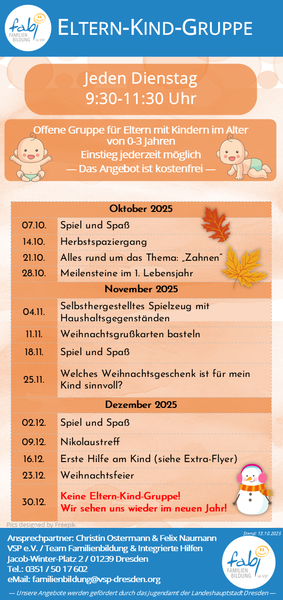 Wie gehabt trefft ihr uns zu unserem regulären Familientreffangebot sowie während der Eltern-Kind-Gruppe vor Ort an.