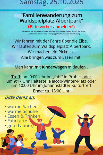 Ende Oktober werden wir gemeinsam mit dem Eltern-Kind-Treff "Mosaik" vom Ausländerrat Dresden e.V. einen Familientagesausflug zum Waldspielplatz in den Albertpark unternehmen.