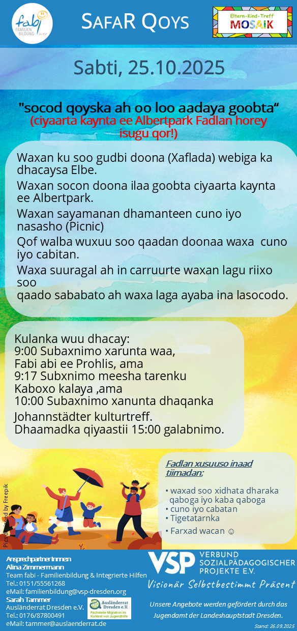 Ende Oktober haben wir gemeinsam mit dem Eltern-Kind-Treff "Mosaik" vom Ausländerrat Dresden e.V. einen Familientagesausflug zum Waldspielplatz in den Albertpark unternommen.