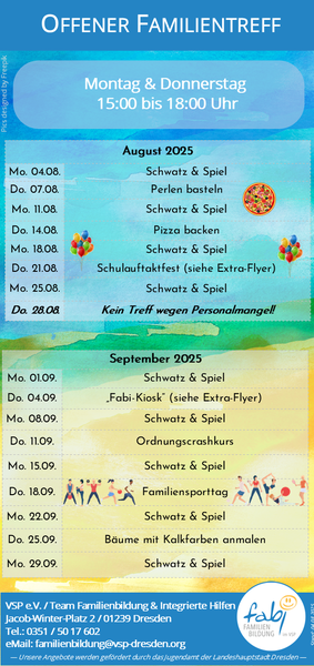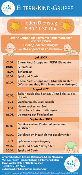 Wie gehabt trefft ihr uns zu unserem regulären Familientreffangebot sowie während der Eltern-Kind-Gruppe vor Ort an.