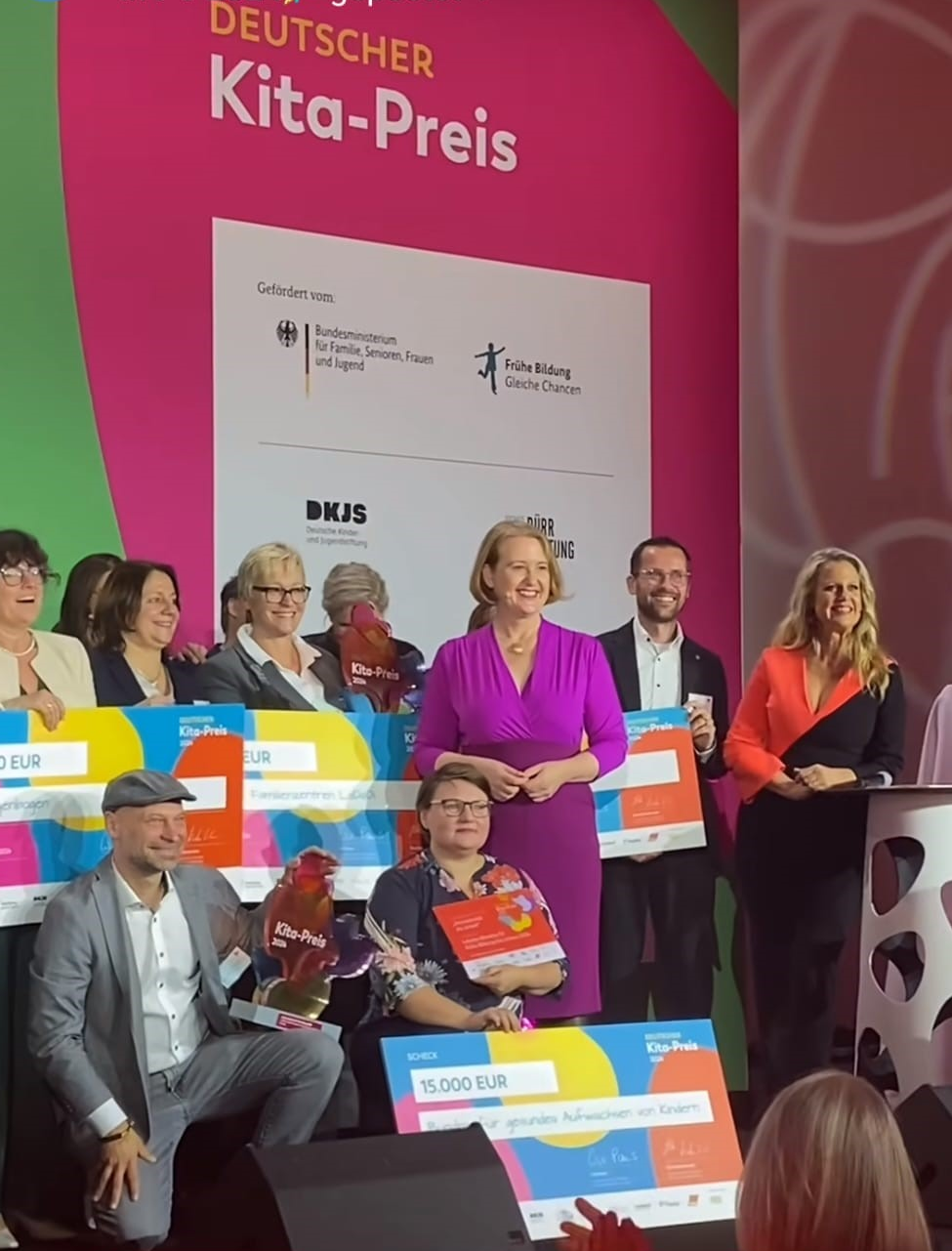 Seit dem 28. November 2024 gehören wir zu den Preisträger*innen des Deutschen Kita-Preises in der Kategorie „Lokales Bündnis für frühe Bildung des Jahres“! Bei der Preisverleihung mit Bundesfamilienministerin Lisa Paus und DKJS-Schirmherrin Elke Büdenbender als Gastgeberinnen wurde unsere Initiative mit dem zweiten Platz, einer Trophäe und 15.000 Euro ausgezeichnet.