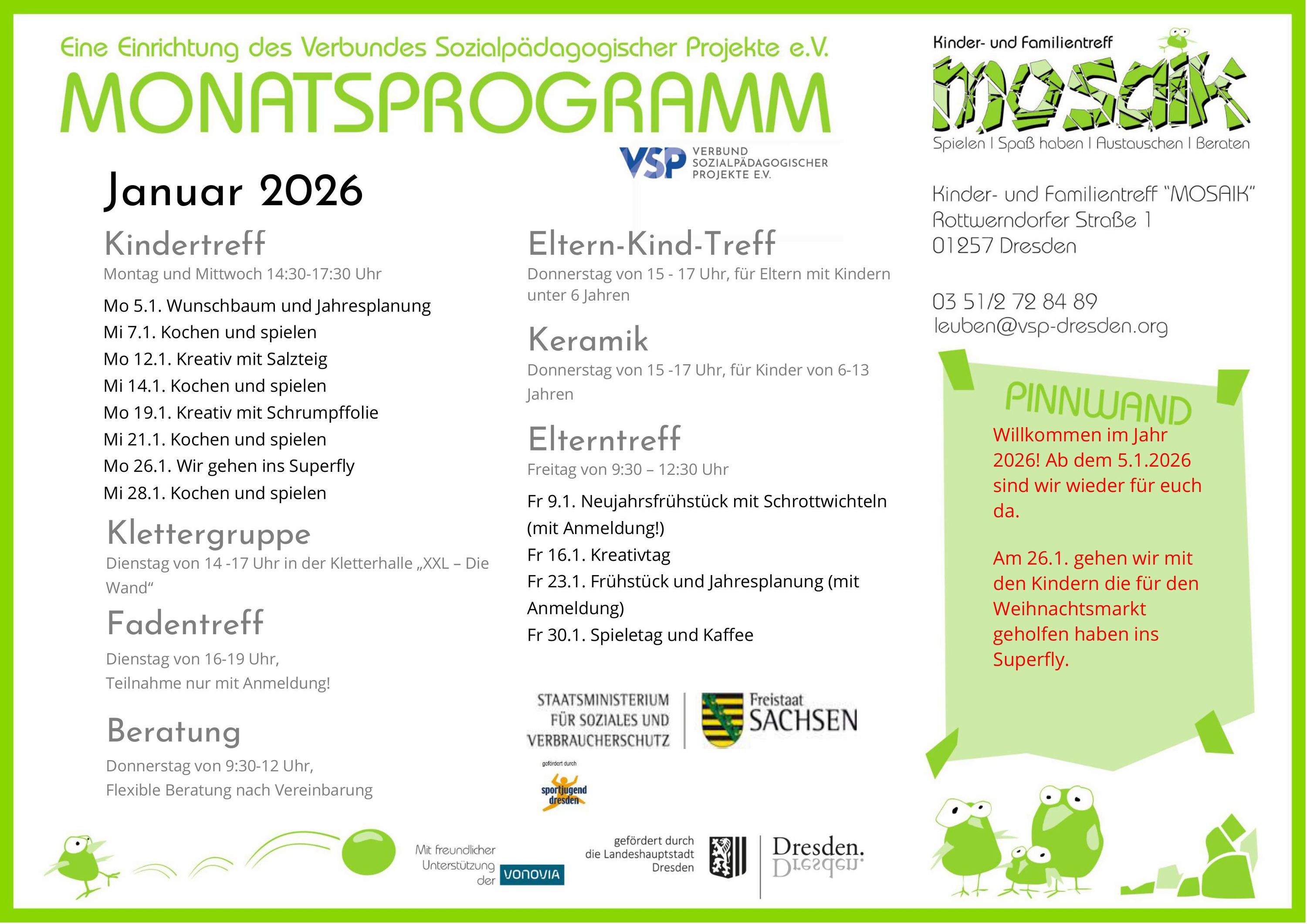 Der Kinder- und Familientreff „Mosaik“ arbeitet in 2 Wohnungen im Erdgeschoß der Rottwerndorfer Straße 1. Zudem stehen den Mitarbeiter*innen in der ersten Etage in einer 2-Raum-Wohnung Räume für ungestörte Beratungen und Büroarbeiten zur Verfügung. Diese beiden Räumlichkeiten wurden uns freundlicherweise durch einen Sponsoringvertrag mit der VONOVIA zur Verfügung gestellt.