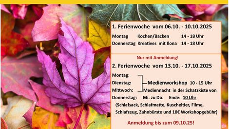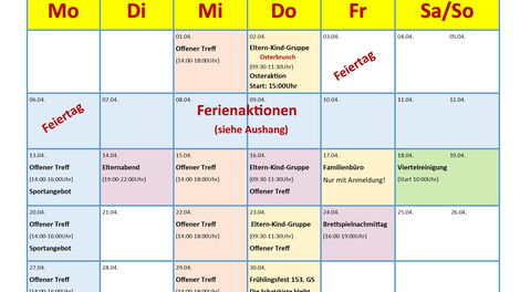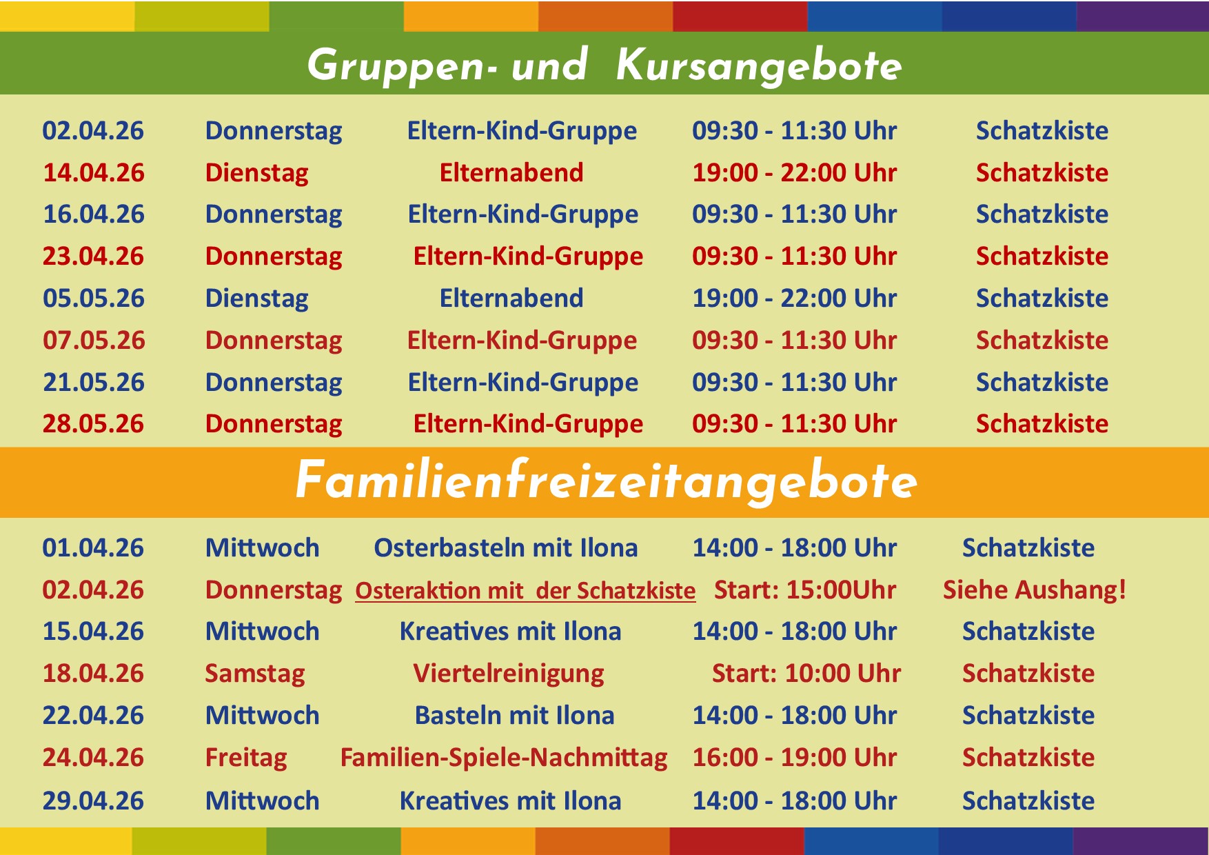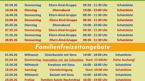 Siehe die Aushänge unten!!! (Familienfreizeitangebote und Gruppen- und Kursangebote)