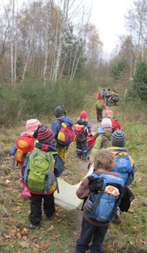 Wir nutzen den Erfahrungsraum Wald mit seinen vielfältigen Impulsen. Hier können Kinder in großem Maße Sinne sensibilisieren, ihren Bewegungsdrang ausleben, Fantasie und Kreativität entfalten. Die Kinder haben bei uns viel Zeit und Raum, sich über ihr Bedürfnis nach Spiel zu entfalten und dabei ihre natürliche Neugier und ihren Wissensdrang zu befriedigen. Sie erfahren und lernen in der Gemeinschaft einen respektvollen Umgang mit Mensch und Natur.